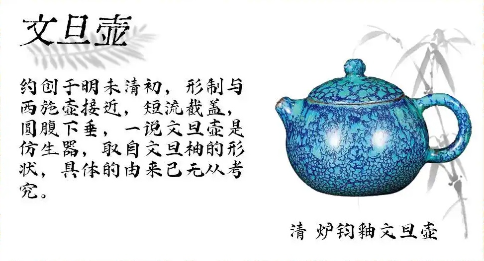 文旦壶。约创于明未清初,形制与西施壶接近,短流截盖,圆腹下垂,一说文旦壶是仿生器,取自文旦柚的形状,具体的由来已无从考究。