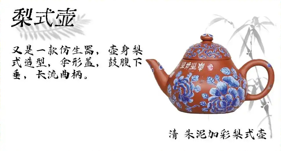 梨式壶。又是一款仿生器,壶身梨式造型,伞形盖,鼓腹下垂,长流曲柄。
