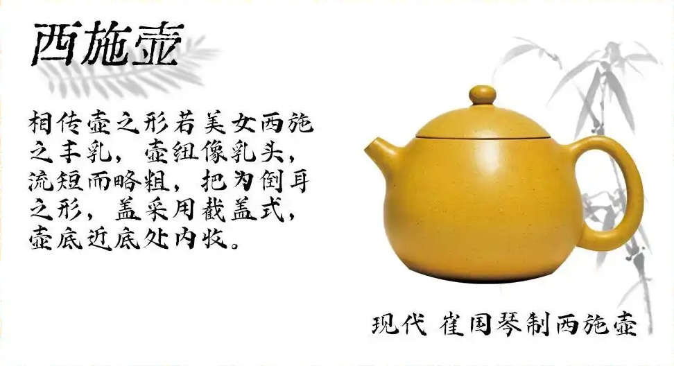 西施壶。相传壶之形若美女西施之丰乳,壶纽像乳头,流短而略粗,把为倒耳之形,盖采用截盖式,壶底近底处内收。