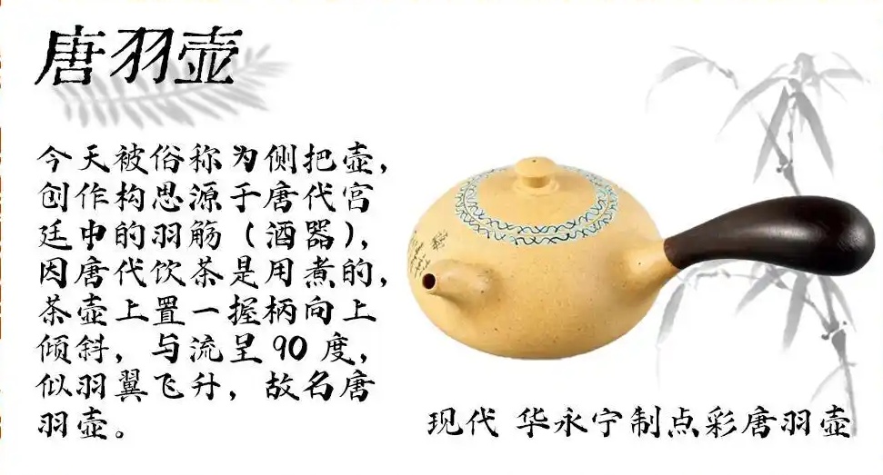 唐羽壶。今天被俗称为侧把壶,创作构思源于唐代宫廷中的羽觞(酒器),因唐代饮茶是用煮的,茶壶上置一握柄向上倾斜,与流呈90度,似羽翼飞升,故名唐羽壶。