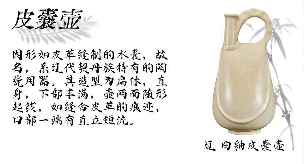 皮囊壶。因形如皮革缝制的水囊,故名,系辽代契丹族特有的陶瓷用器。其造型为扁体,直身,下部丰满,壶两面随形起线,如缝合皮革的痕迹,口部一端有直立短流。