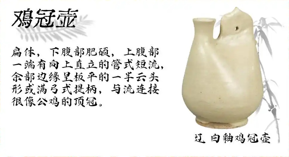 鸡冠壶。扁体,下腹部肥硕,上腹部一端有向上直立的管式短流,余部边缘呈板平的一半云头形或满弓式提柄,与流连接很像公鸡的顶冠。