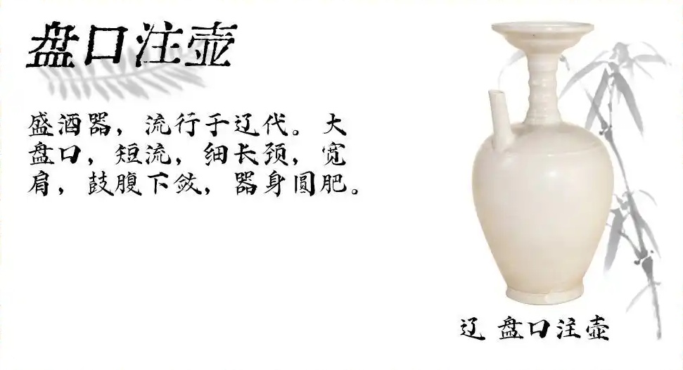 盘口注壶。盛酒器,流行于辽代。大盘口,短流,细长颈,宽肩,鼓腹下敛,器身圆肥。
