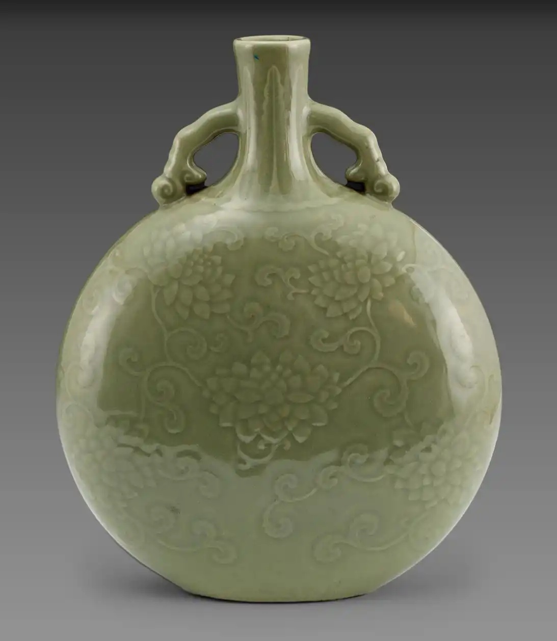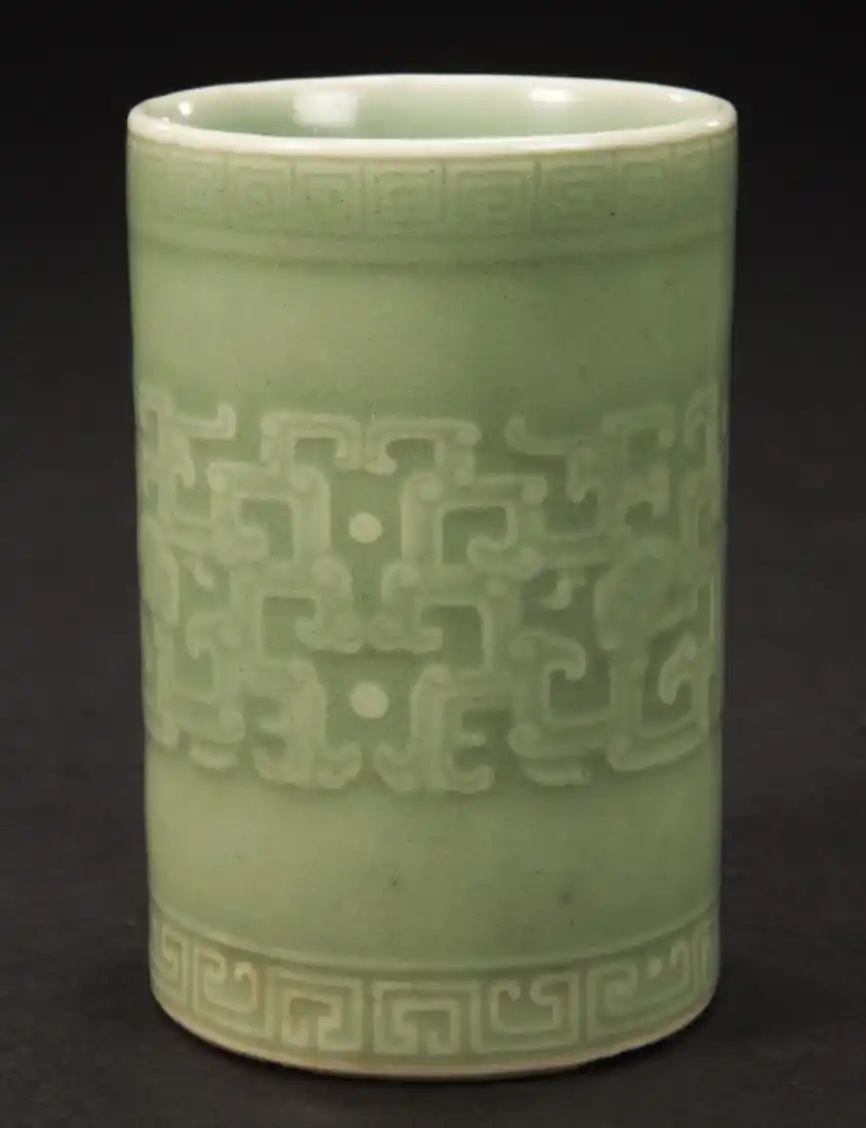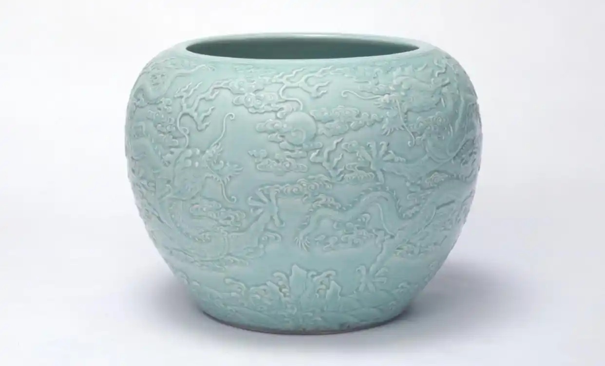冬青釉,介于上述两种釉色之间,青中闪绿。色彩明度不及粉青般明亮,却也不像豆青那般暗淡,青中泛黄并不明显,最接近于蓝绿中间色,釉面肥润如玉,光泽柔和。