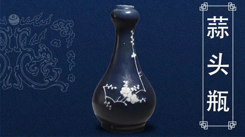 蒜头瓶。最早见于商周时期的青铜器,后世被瓷器替代,明清时期广为流行。起初瓶口部有类似蒜瓣状等分凸起,也因此而得名,至明代逐渐简化,口部已完全类似球形。细颈、溜肩、圆腹,底部有圈足,通常器型较小。