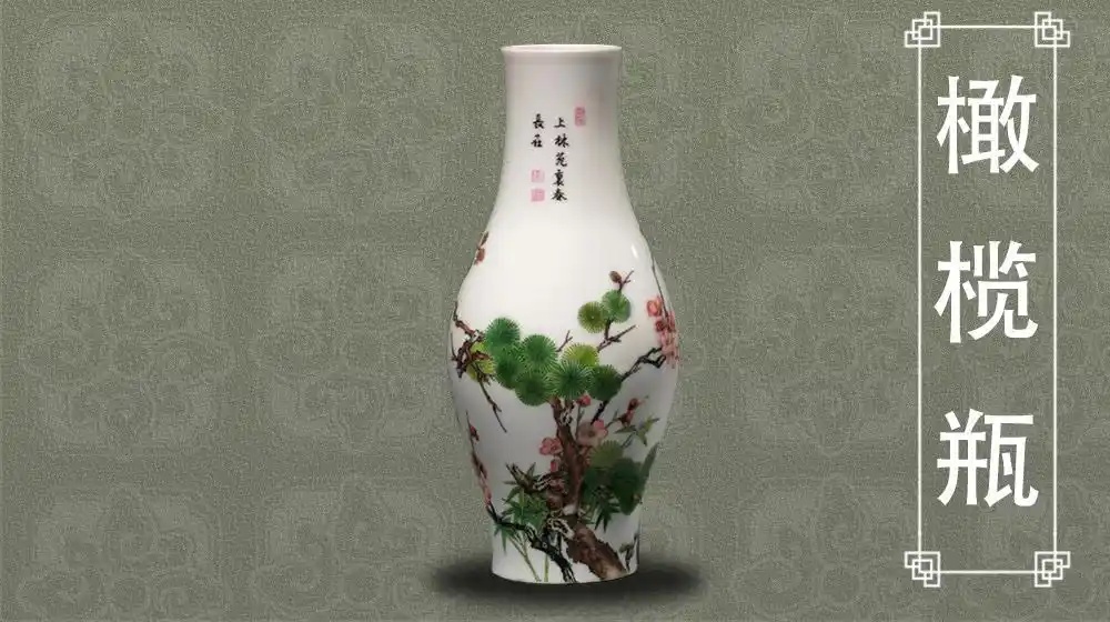 橄榄瓶,形似橄榄而得名。口微撇,短颈,腹部微鼓,至胫部内敛,底足外撇。橄榄瓶的器型特征是瓶身上下部分,几乎是以腰线对称,口足大小相近。