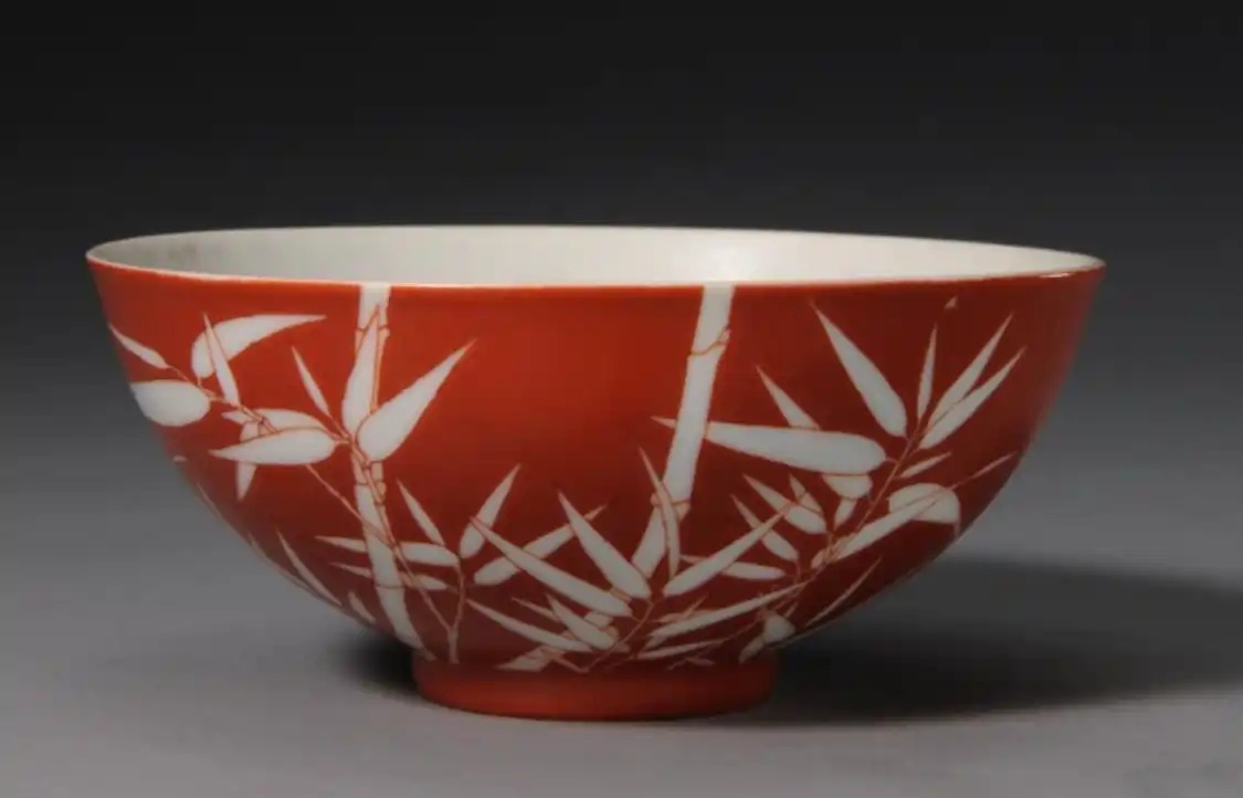 珊瑚红釉白竹纹碗 清代