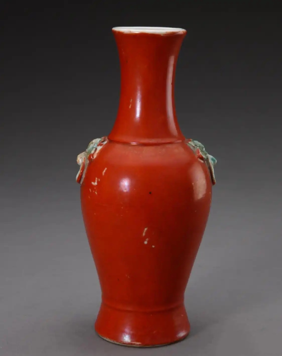 珊瑚红釉粉彩蝶耳撇口瓶 清代
