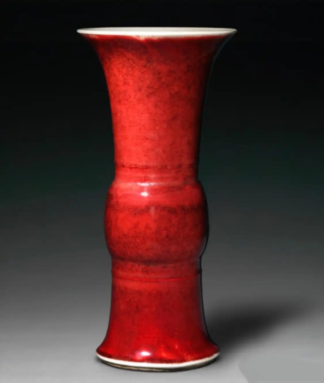 脱口垂足郎不流,即使初识瓷器的藏友也大多听过这句关于郎窑红的描述。郎窑红可以说是所有红釉瓷器中颜色最为夺目的一种。其色彩绚丽浓艳,釉表呈现明显的玻璃质光泽。因为釉料肥厚,烧制时向下垂流,大多郎窑红瓷器的口沿会漏出白胎。工匠们为了防止流釉粘底,在底足处刮出一圈二层台阻挡釉料垂流,这也是郎窑红的又一典型特征。