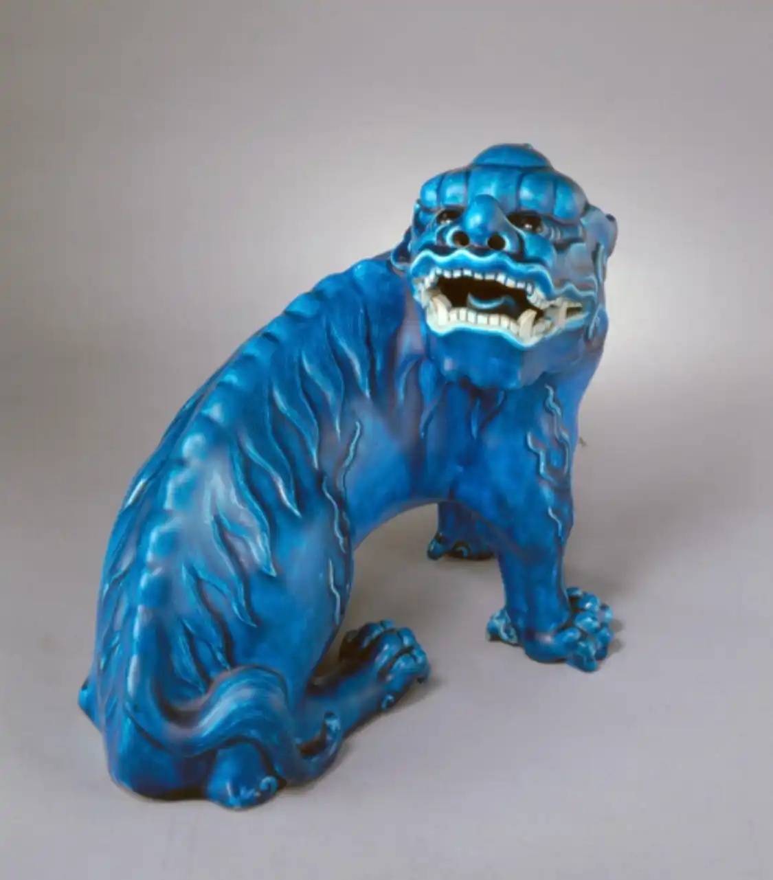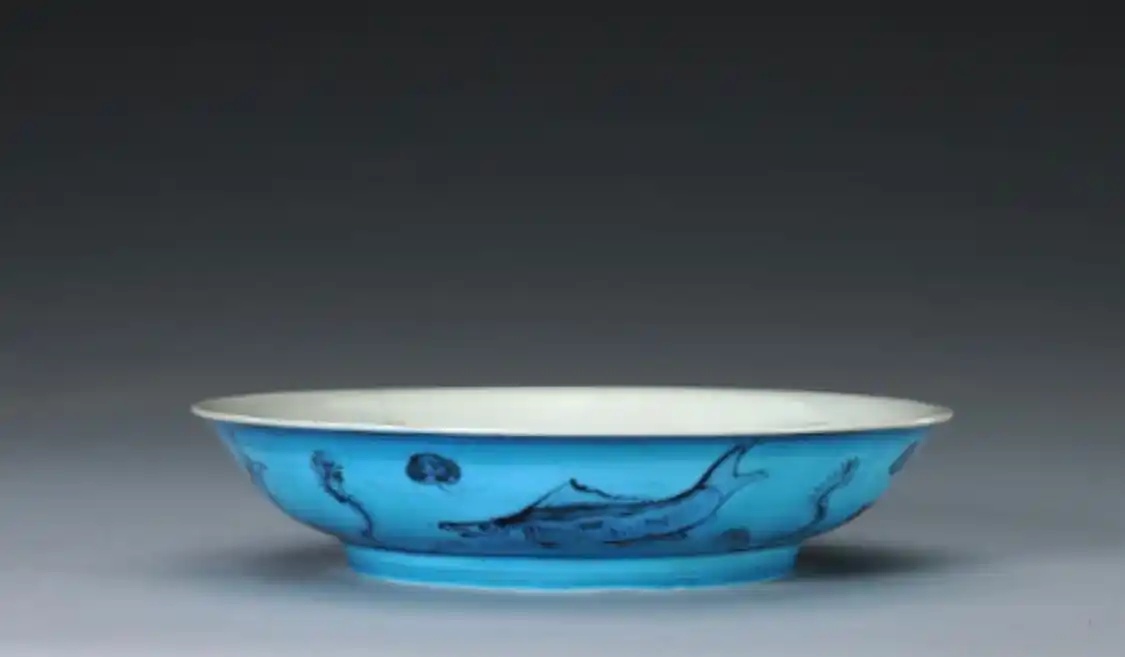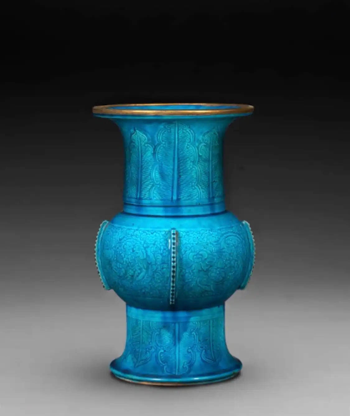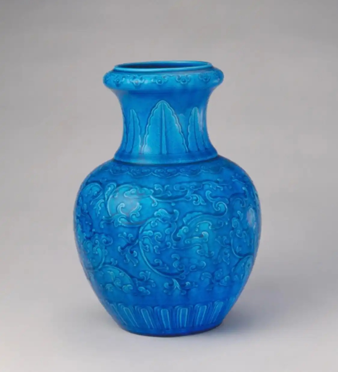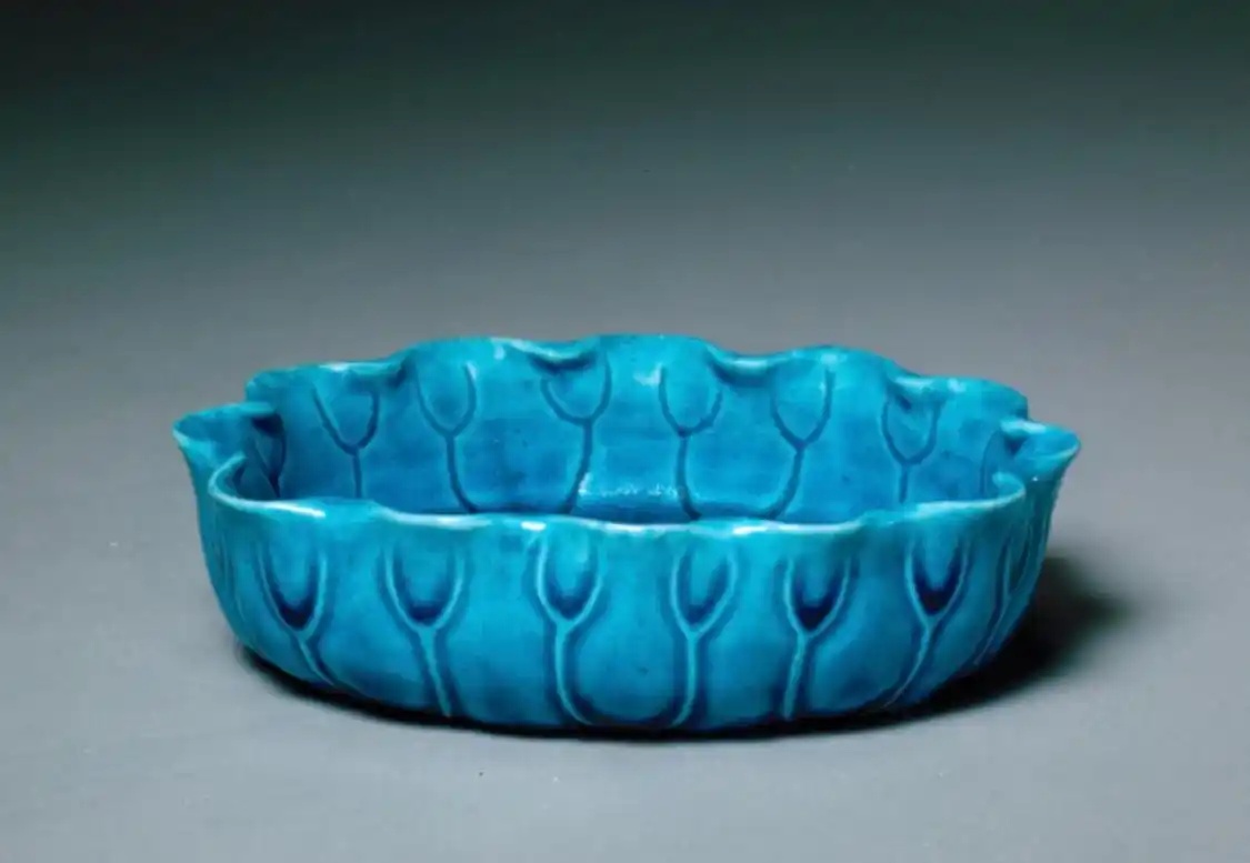 孔雀绿釉,又叫“法翠釉”“翡翠釉”。发色浓烈艳丽,釉面多明亮通透,看着像孔雀尾巴上漂亮的羽毛,所以得名。