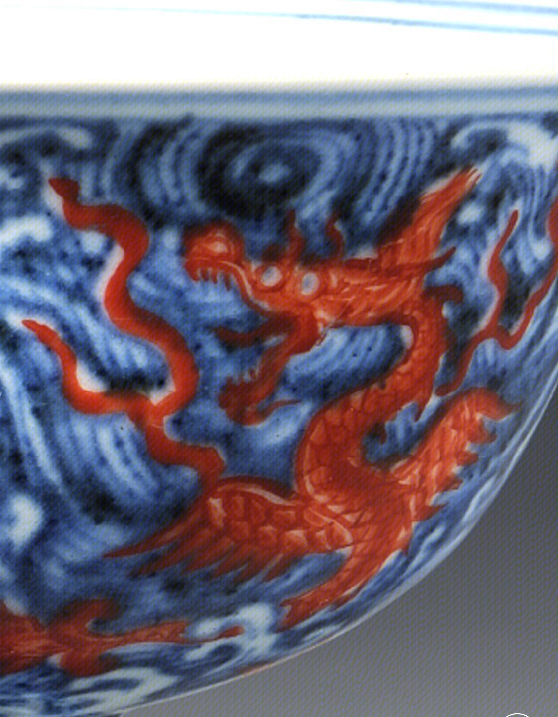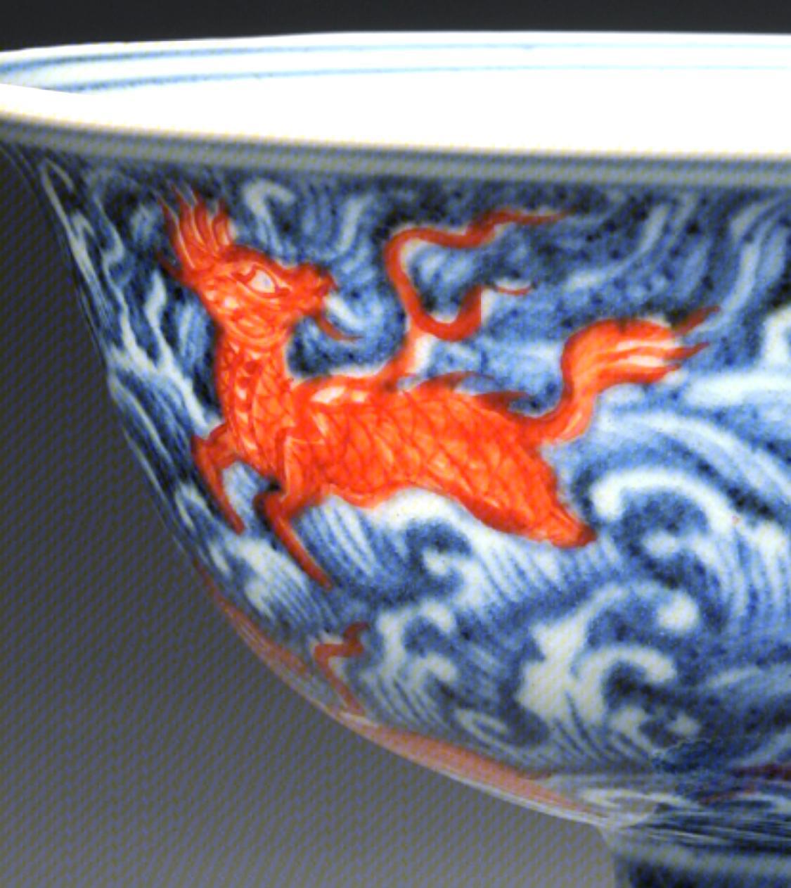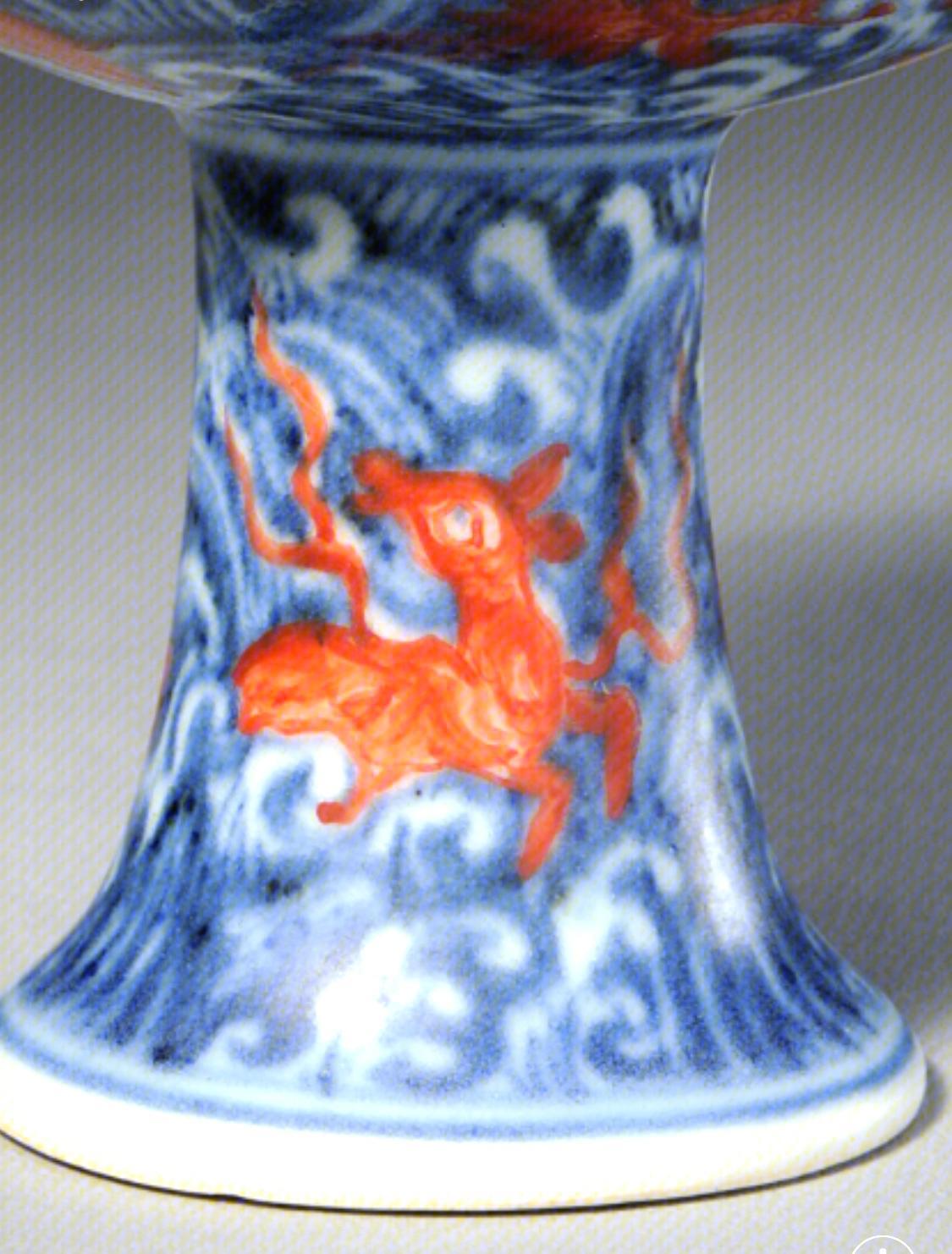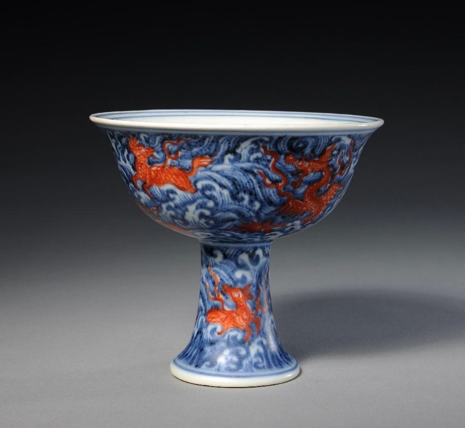 青花矾红彩海水异兽纹高足杯
