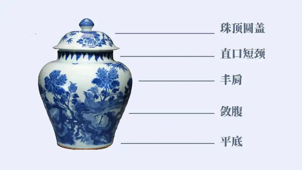其罐身特征:直口短颈、丰肩敛腹、平面砂底,通体浑圆,附带珠顶圆盖。而将军罐正是因为这珠顶圆盖颇似将军的头盔,所以得名。