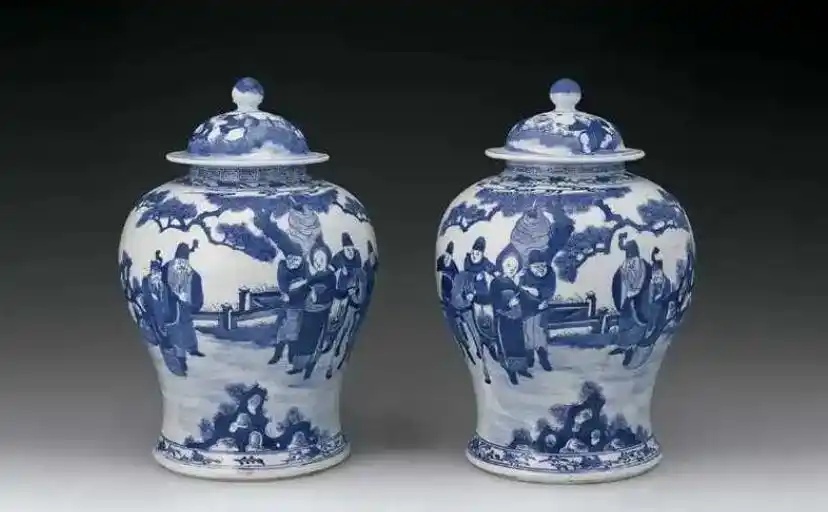 由于将军罐器型较大,所以其纹饰更适合描绘人物故事、戏曲篇章等,高大的将军罐可以让这些繁缛的画片更充分的展示。在清代后期乃至民国,将军罐大量烧制,甚至是富足人家婚礼嫁妆必备。