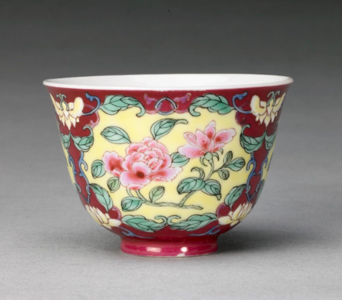 胭脂紫地粉彩开光月季花纹杯 图3