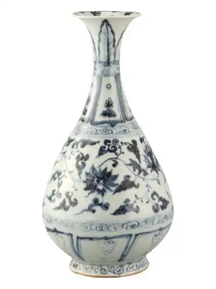元代青花瓷器中的莲花纹花瓣由两道外粗内细的线构成,莲瓣之间留有空隙。