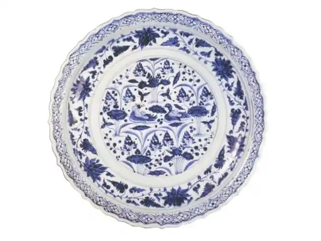 青花鸳鸯莲花纹盘,纹饰整体构图饱满,绘画细腻精致,以青花双圈线隔成多层带状,各层花纹之间主次分明,从中可以体会出这一时期人们对莲花的理解