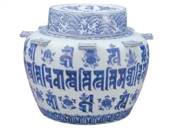 又如明宣德的青花梵文出戟盖罐,腹部纹饰为一周蓝查体梵文种子字,肩与胫部各写有八个梵文,扳手上绘折枝花卉,罐底绘莲瓣纹。