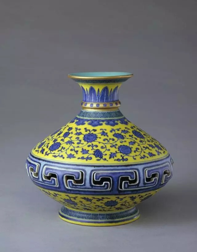 黄地青花缠枝花纹转心瓶