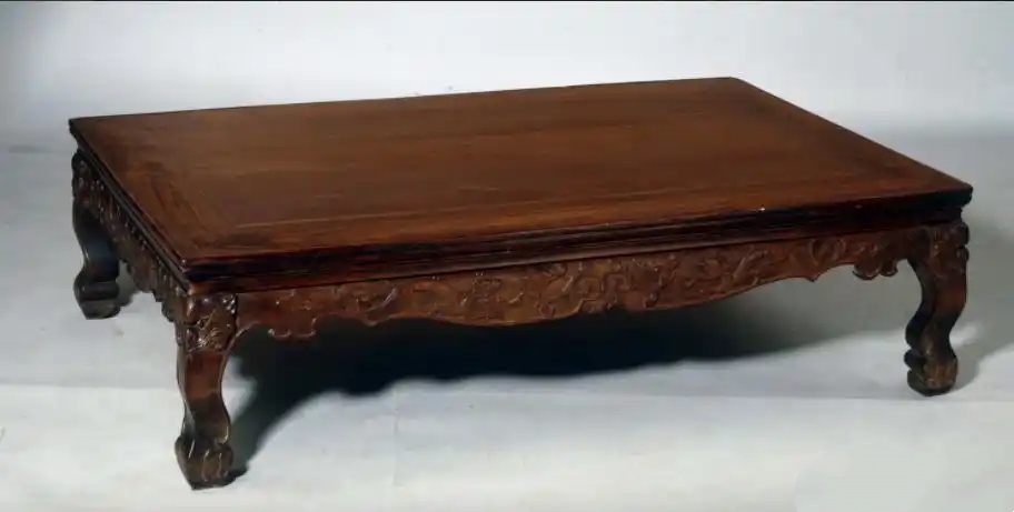 此炕桌为束腰三弯腿造型,与无束腰直足类型的炕桌形成了鲜明的对照。此形制的炕桌造型独特,较为少见。此桌采用齐牙条的做法,也就是说牙条与桌腿不是以45度角连接,而是垂直连接,因此上面精细雕刻的双螭卷草灵芝纹能完美的展现出来。牙条就是桌面下边的四个边。明代的《鲁班经》中有记载:四齿方桌的雕刻一般见于桌腿的肩部。此炕桌腿足肩的兽纹“兽发飞扬,双眼愤睁,鼻息呼之欲出”。牙条上雕刻着对峙的两条螭纹,体态轻盈但不失威猛和灵动。