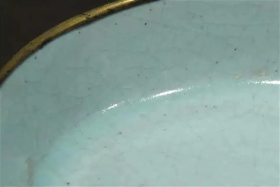 而在高倍放大镜下观察釉内气泡时,可以看到气泡大小不一,略显稀疏,所谓寥若晨星,有学者认为气泡“如星斗有距离地分布在全品上”,且“气泡比官、哥的大,而明亮如珠”。