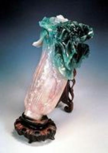 原料:翠玉白菜的原料来自缅甸,它的翠色晶润淡雅,通透无暇。自古以来,人们鉴赏翡翠首先要看它的“种”。“种”多指翠玉的颜色和通透程度,有“玻璃种”、“水种”、“蛋清种”、“金丝种”、“芙蓉种”和“紫罗兰种”等。其中,透明度高,水分充足,颜色纯正的翡翠被称为老坑玻璃种。