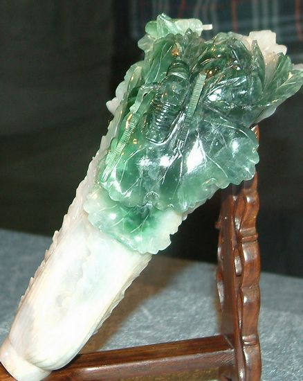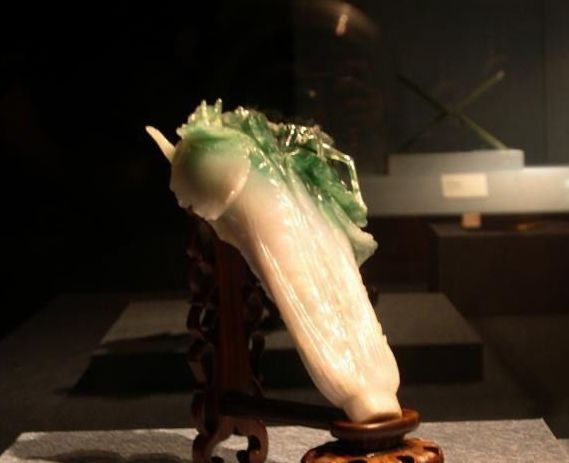 大陆内地的翠玉白菜:1950年天津的文物专家乐翻天了!因为他们居然在天津市财政局的一个库房发现一棵翠玉白菜。内地大陆现有的翠玉白菜一棵在天津博物馆,一棵在北京博物馆。相比较于台北故宫,北京博物馆的翠玉白菜就显得默默无闻!倒是天津博物馆的翠玉白菜在富贵中还带着亲民的味道。论起质地,天津博物馆的这棵翠玉白菜没有台北故宫的好,但是天津的翠玉白菜拥有白绿黄三个颜色,工匠大胆地取原本应该是缺陷的黄色进行巧雕,反而将白菜天然的感觉给写实地表现出来。有关人士还将这棵翠玉白菜别称为“冻白菜”,真是太传神了!还有一棵更精绝的翡翠大白菜不知去向,这棵白菜必须由慈禧谈起,根据《爱月轩笔记》,慈禧太后陪葬品中有一棵大型翡翠白菜,绿叶白心,菜梗上还刻着一只振翅的蝈蝈,另外还有两只红白相间的马蜂,这棵举世绝品的翠玉白菜不知去向。1928年爆发了震惊国际的慈禧陵寝盗墓案。该年七月孙殿英率部众荷枪实弹进入清东陵,用炸药炸开了乾隆皇帝和慈禧太后的陵寝,并将陪葬宝物洗劫一空。这颗大白菜成为历史的悬案。