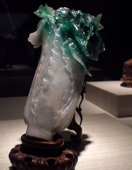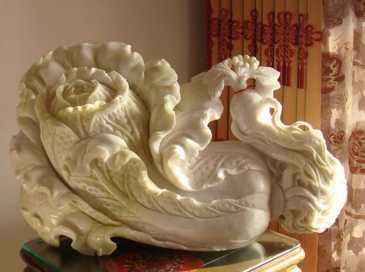 翠玉白菜与真实白菜相似度几乎百分百的作品,是由翠玉所琢碾而成,亲切的题材、洁白的菜身与翠绿的叶子,都让人感觉十分熟悉而亲近,别忘了看看菜叶上停留的两只昆虫,它们可是寓意多子多孙的螽斯和蝗虫。此件作品原置于紫禁城的永和宫,永和宫为光绪皇帝妃子瑾妃的寝宫,因此有人推测此器为瑾妃的嫁妆象征其清白,并企求多子多孙。