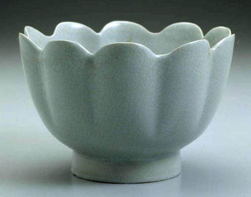 莲花式温碗:宋汝窑(A.D.960~公元1279)、汝窑,为冠绝古今之中国磁器名窑。器作十瓣莲花形。以莲花或莲瓣作为器物之纹饰及造型,随佛教之传入而盛行,尔后更取其出泥不染之习性,寓意廉洁,广为各类器所采用。本器状似未盛开莲花,线条温柔婉约,高雅清丽。原器应与一执壶配套,为一温酒用器,晚唐至宋所常见。