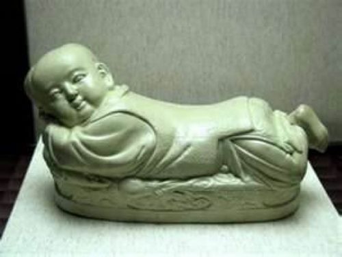 婴儿枕、宋定窑(A.D.960~1279)、台北“故宫”博物院、瓷枕造型采婴儿侧卧于榻上,头微扬、宽额、身硕、双手交叉为枕,两脚弯曲交迭,状极悠闲。左手执一状似彩球童玩,丝带贯穿,上下以蝴蝶结饰固定。婴儿脸部交待清晰写实,模样雅稚可人,衣饰以今日用语应是:身着长袍,外加背心,长裤,布鞋。背心前襟饰钱形纹,后背划牡丹,长袍下裳印圆形团花,衣袖长裤无纹饰,显示以不同布料缝制而成。榻周开光,印有龙纹,底平无釉,刻乾隆御制诗。