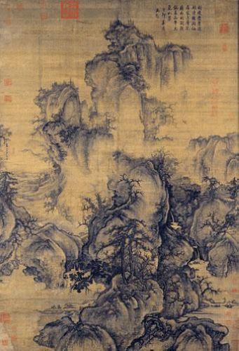 曹昭《格古要论》:“郭熙山水其山耸拔盘回,水源高远,多鬼面石。乱云鹰爪树,松业攒针,杂叶夹笔,单笔相半,人物以尖笔带点凿,绝佳。”