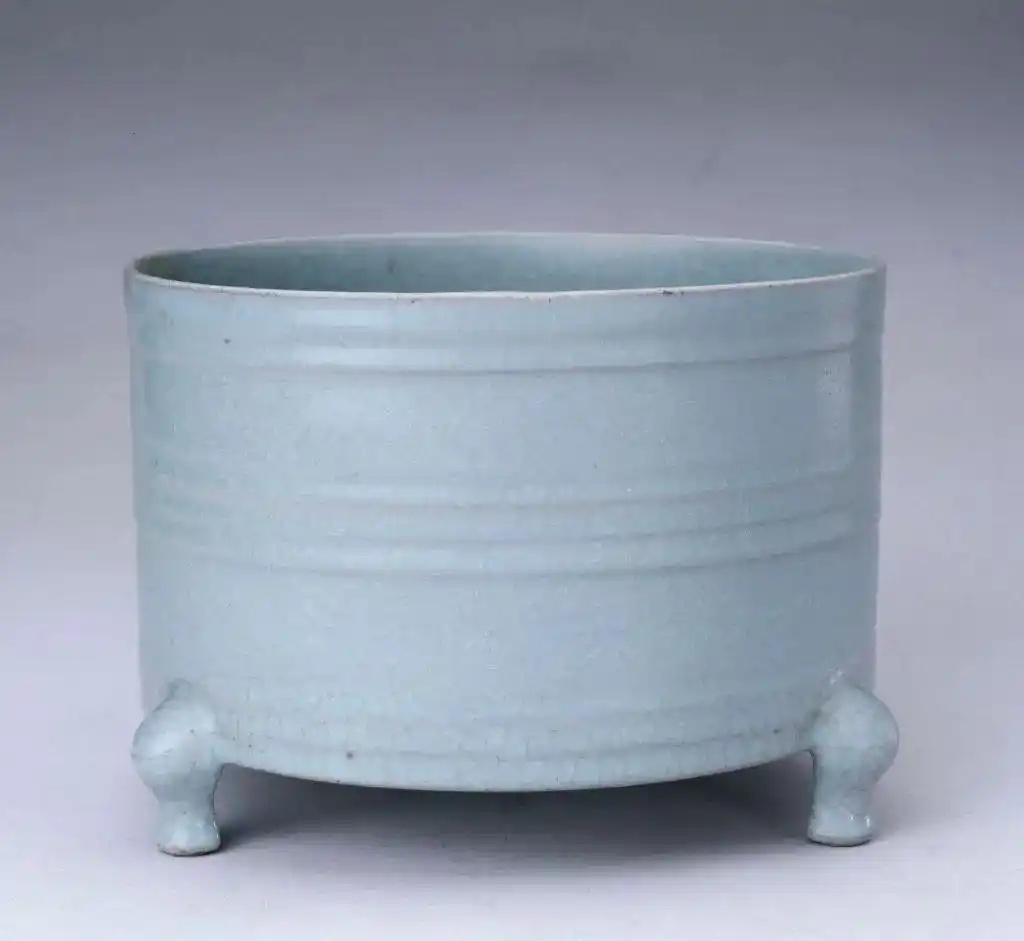 此炉仿汉代铜器造型。直口,平底,口径和底径相若,下承以三足。通体满施淡天青色釉,莹润光洁,釉面开细碎纹片,足端无釉。外壁近口沿处、近底处各凸起两道弦纹,腹部中间凸起3道弦纹。外底有5个细小支钉痕。 瓷釉开片系因胎、釉膨胀系数不同而在焙烧后冷却时所形成,在瓷器流传过程中如遇冷热变化仍会继续开裂。它本属于釉的一种缺陷,但因其片纹自然天成、生动有趣,遂逐渐被视作一种特殊的装饰。汝窑青瓷釉面大都开有层层相叠的“冰裂纹”,自然天成,耐人回味。 从文献记载来看,汝窑为宫廷烧造瓷器的时间在北宋晚期,有学者推测大概只有20年或40年。由于烧造时间短,致使产品流传至今的不多,从公开发表的资料看,传世品不足百件。已知传世汝窑三足樽式炉仅3件,现分别藏于故宫博物院、英国伦敦大维德基金会和美国辛辛那提博物馆。