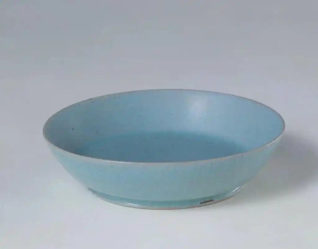 盘撇口,浅弧壁,坦底,圈足外撇。通体内外施天青色釉,釉面开细碎片纹。因采用“裹足支烧”,因此外底留有5个细小支钉痕。