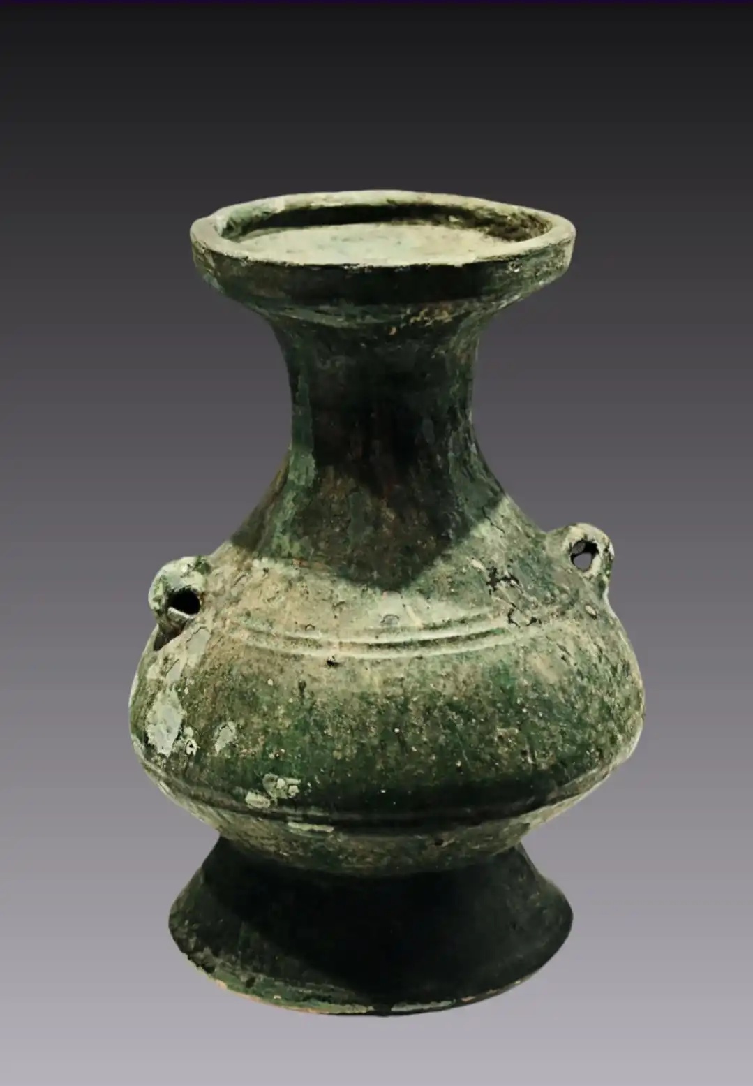 此壶为东汉时期的陶器。壶直口,束颈,溜肩,肩部装饰有镂孔双系,鼓腹,喇叭足。其造型仿自青铜器,器形端庄稳重。通体施以氧化铅为主要助熔剂的低温釉。因釉料中含有少量的氧化铜,故器物釉面为绿色。在我国,低温铅釉在汉代已相当普遍。它的特点是釉面光泽强,表面平整光滑,釉层清澈透明,犹如玻璃一样,但硬度比较低,容易出现划痕,化学稳定性较差。传统的低温色釉的主要品种有绿、黄、蓝、红、紫等多种。铅在潮湿的环境中受到水和大气的侵蚀,在一定条件下,受侵蚀的部分渐从绿色的釉面析出,经长期积淀形成的物质使器表呈现出银白色的光泽,故称铅绿釉,又称银釉。