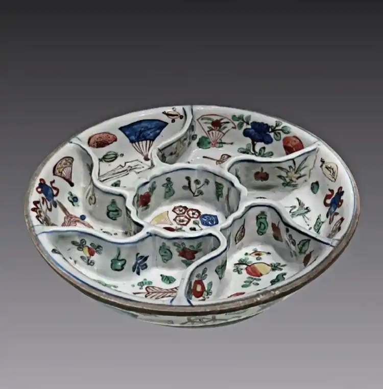 明代五彩瓷以釉上彩技术突破青花垄断,此盒为万历年间民窑精品。其纹饰融合佛道符号与世俗愿望,反映了明代社会的多元信仰。值得一提的是,此类果盒多用于盛放干果或首饰,是当时文人雅士案头必备之物。