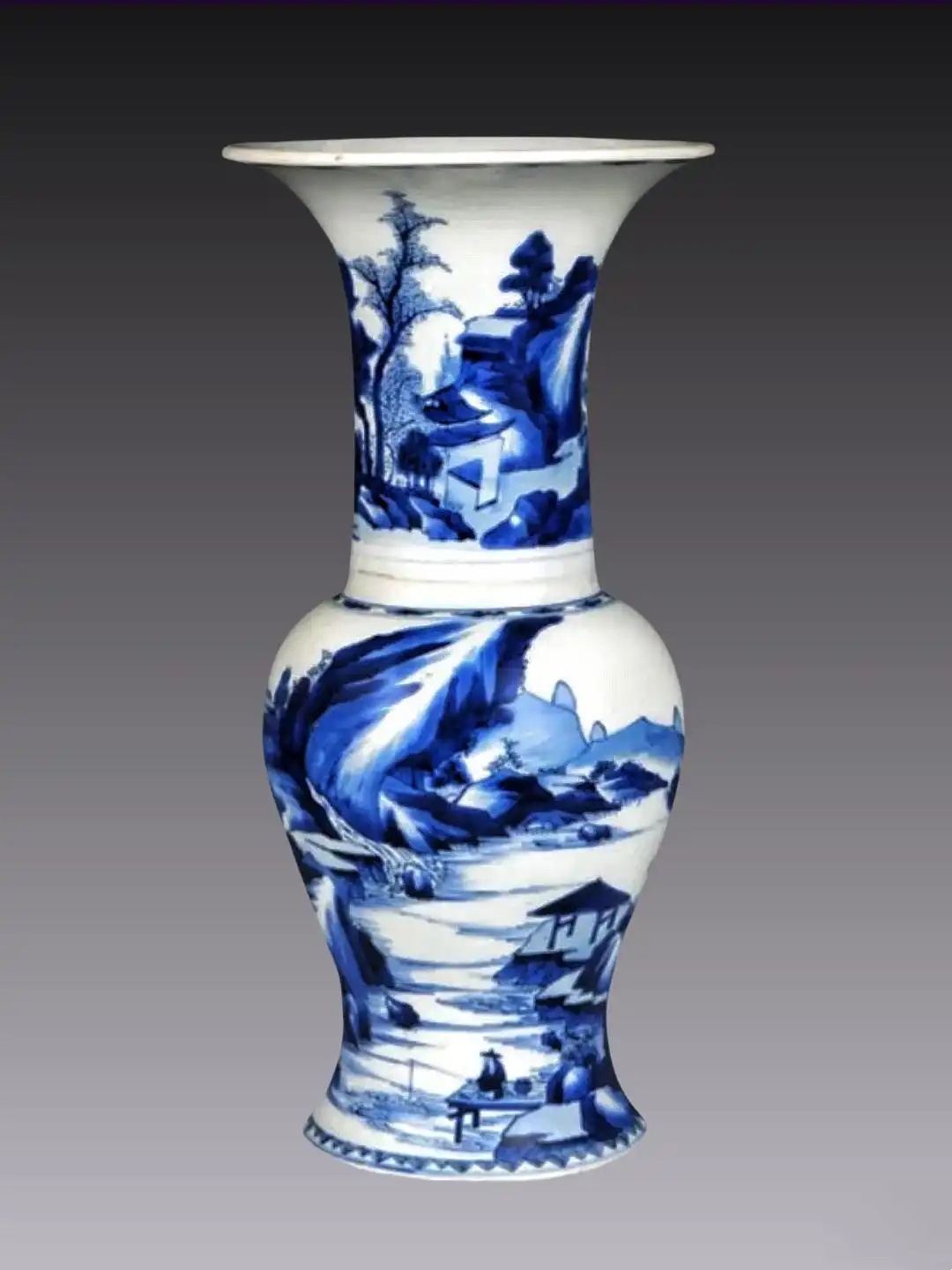 青花色泽青翠艳丽,浓淡相宜,层次丰富。运用青花“混水”技法,将青花料分头浓、正浓、二浓、正淡、影淡五个色阶,以浓淡不同的青料描绘远山近水,犹如中国传统水墨画般清朗不浑、艳而不俗。