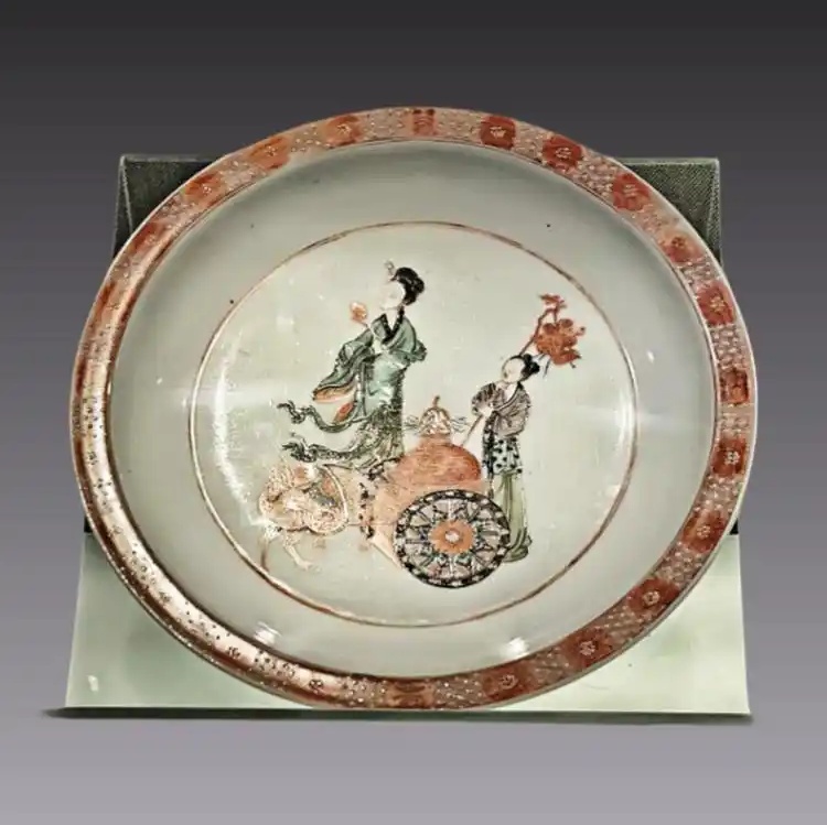 麻姑献寿图,画的是麻姑在西王母寿辰之日赴宴祝寿的场景。盘子不大,但整个画面却疏密有致,内涵丰富。麻姑手持如意,裙带飘扬;侍女娴雅安静,喜气盈盈,肩扛挂满灵芝宝物的龙头杖;仙鹿拉着装满美酒佳酿的酒坛,不时调皮地雀跃回眸。边脚纹饰以矾红彩绘出莲花、龟背锦并配以四字篆书“万寿无疆”。