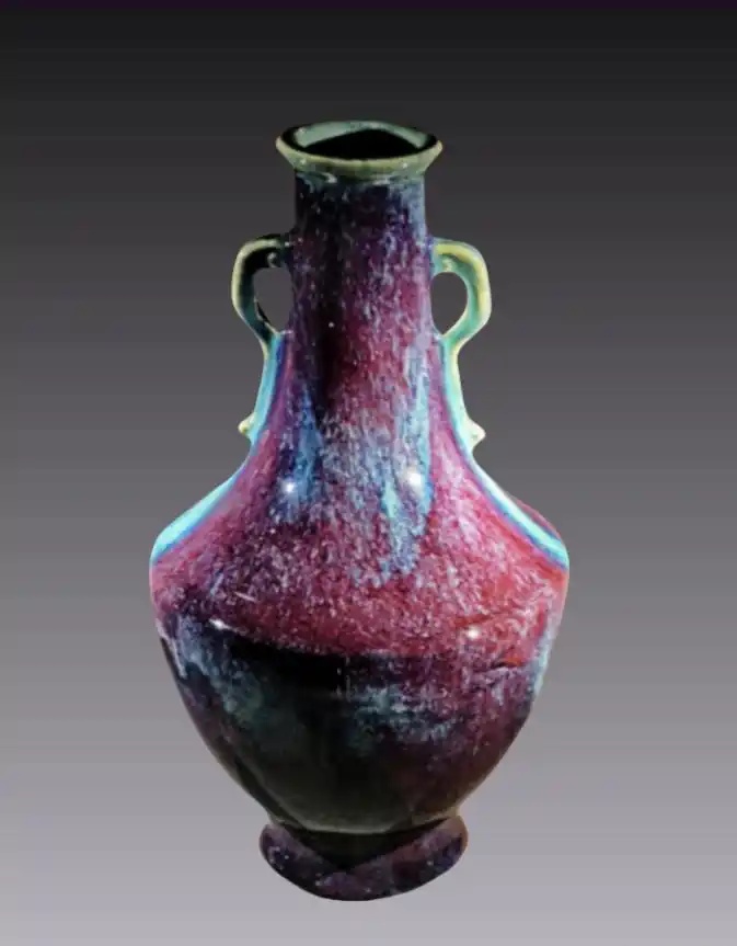 此瓶双耳造型典雅,通体施窑变釉,釉色如火焰流淌,红、蓝、紫三色交织,绚丽如晚霞。窑变釉为清代单色釉的创新品种,因烧制时釉料自然流淌形成不可预测的纹理,故有“入窑一色,出窑万彩”之说。