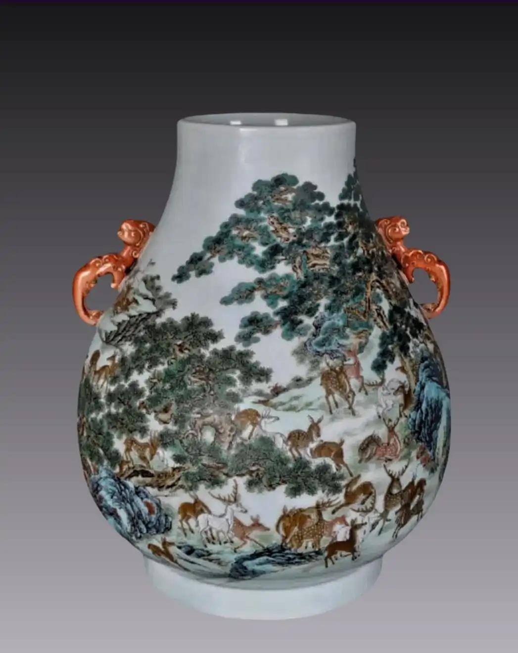 此类绘画瓷器的题材源于清代皇室“木兰秋狝”的狩猎传统,指的是秋天打猎马鹿、麋鹿等。百鹿尊华美富丽,寓意吉祥。古人视鹿为瑞兽,有祥瑞之兆。因“鹿”与“禄”谐音,“百鹿”又称“百禄”,有祝颂加官进禄、官运亨通的吉祥之意。白鹿还象征王者的贤德,苍松长青象征“高寿”与“刚毅”,纹饰寓意丰富。