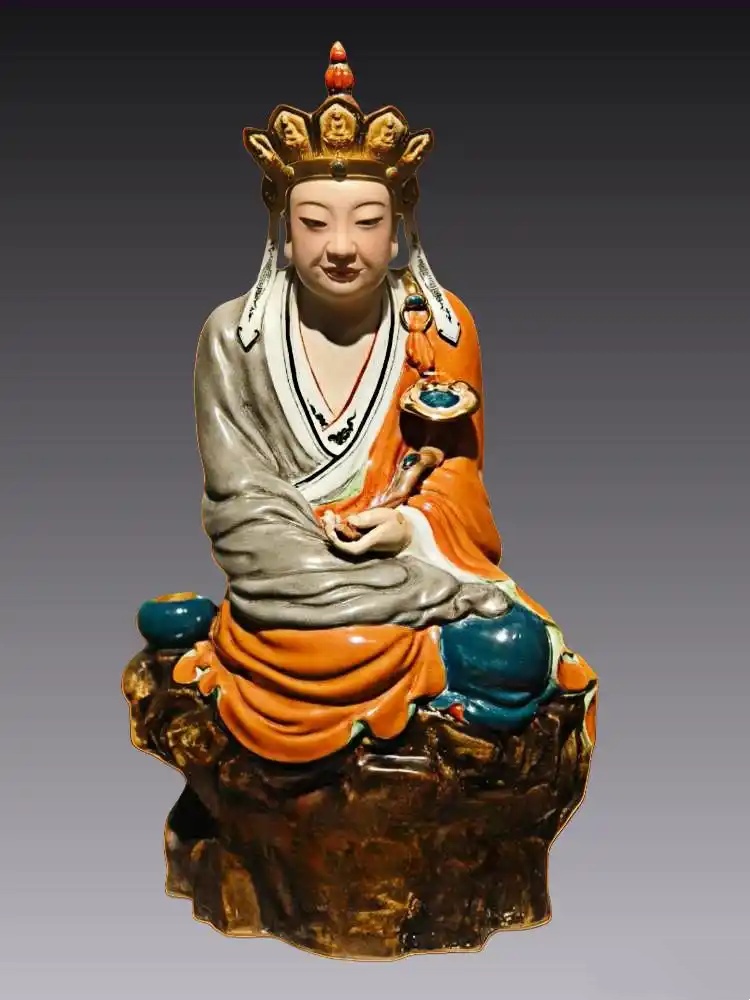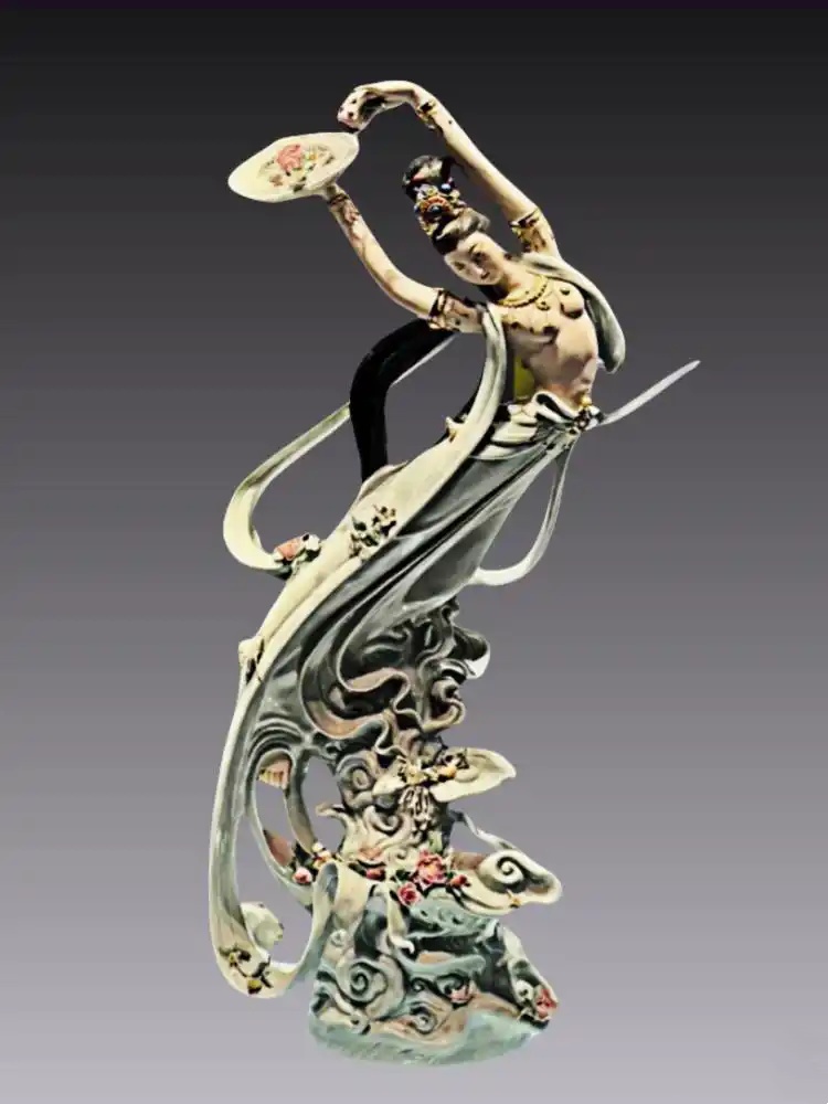 豆青釉的色泽温润淡雅,宛如初春的新绿,给人一种宁静而舒适的感觉。加彩的天女散花图案更是精美绝伦,天女身姿婀娜,衣带飘飘,手中挥洒着五彩斑斓的花瓣,仿佛将我们带入了一个梦幻般的仙境。