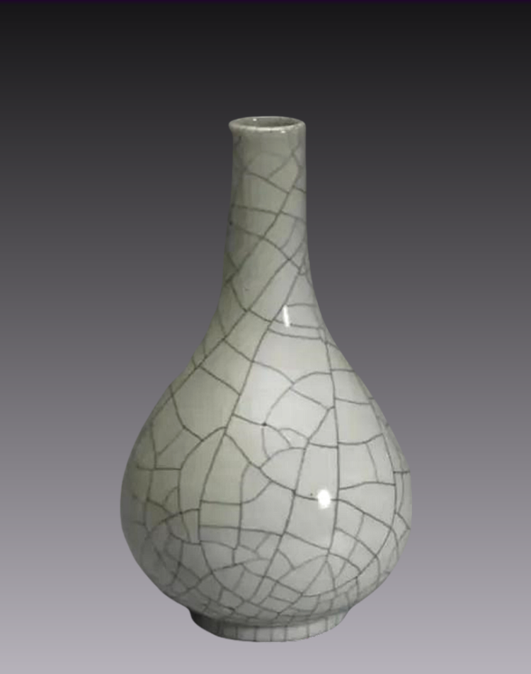 “胆瓶”即“胆式瓶”,是一种经典的瓷瓶式样,因口、颈相连,颈部较长,肩下渐硕,下腹部丰满,形如悬胆,故名胆瓶。这种器形创烧于唐代,兴盛于北宋,形式在南宋时期稳定下来。当时钧窑、哥窑、耀州窑均有烧造。