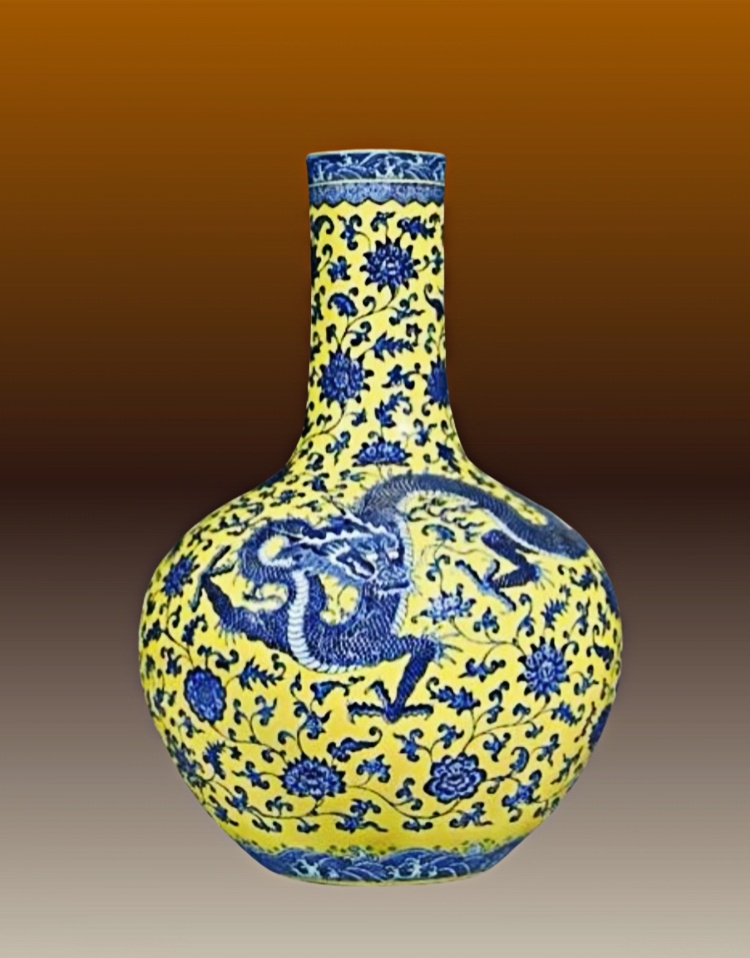 4、历年拍卖第四名 清乾隆 黄地青花穿花龙纹天球瓶