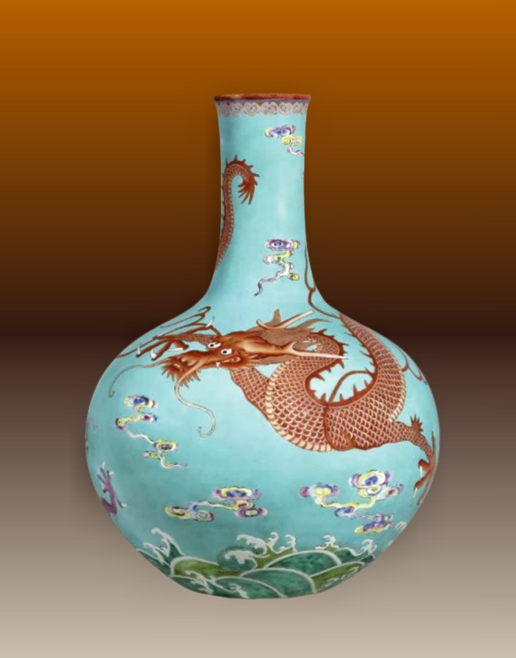 9、历年拍卖第九名 清乾隆 松石绿地洋彩苍龙教子祥云海水纹天球瓶