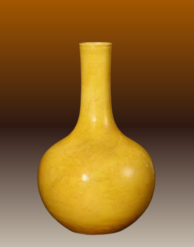36、清嘉庆 黄釉刻苍龙教子云龙纹天球瓶 北美十面灵璧山居藏