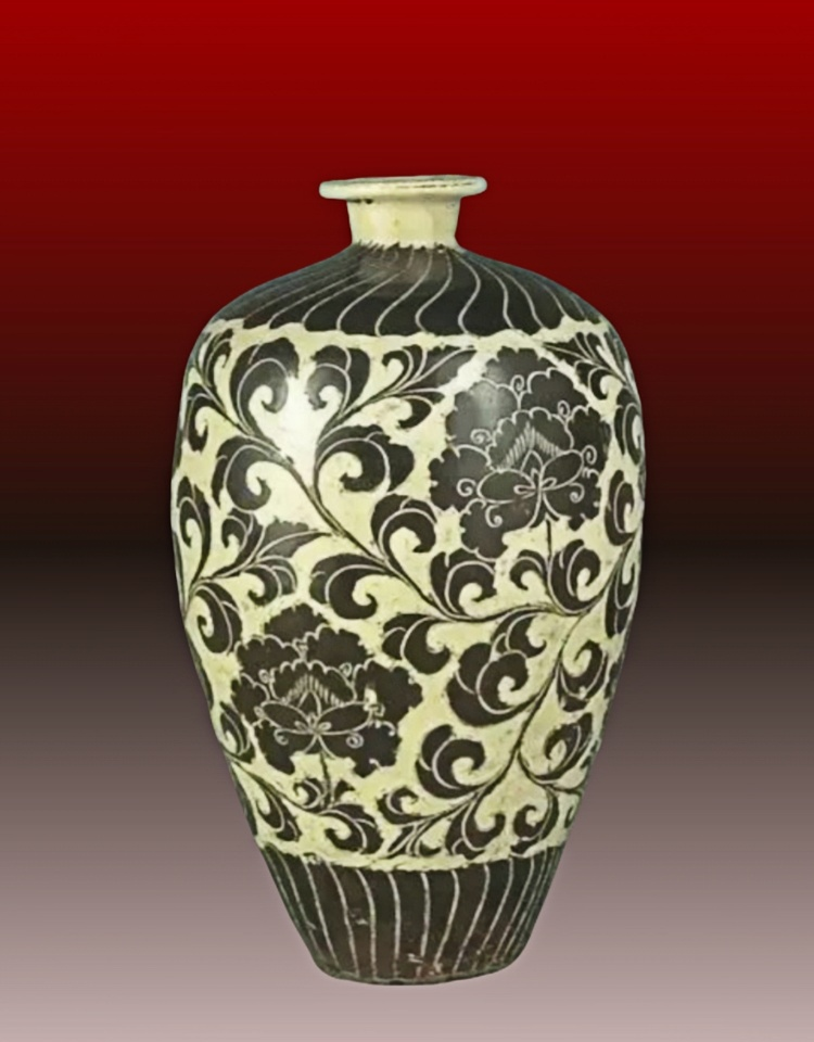 36、纽约大都会博物馆藏 北宋磁州窑白地剔绘赭花缠枝牡丹纹梅瓶