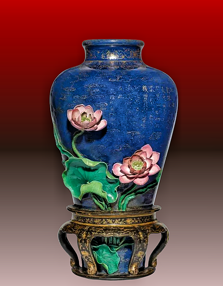 44、中国嘉德2021春季拍卖会 清乾隆 洒蓝釉描金御题诗文堆塑粉彩荷花连瓷仿黑漆描金座梅瓶式大壁瓶