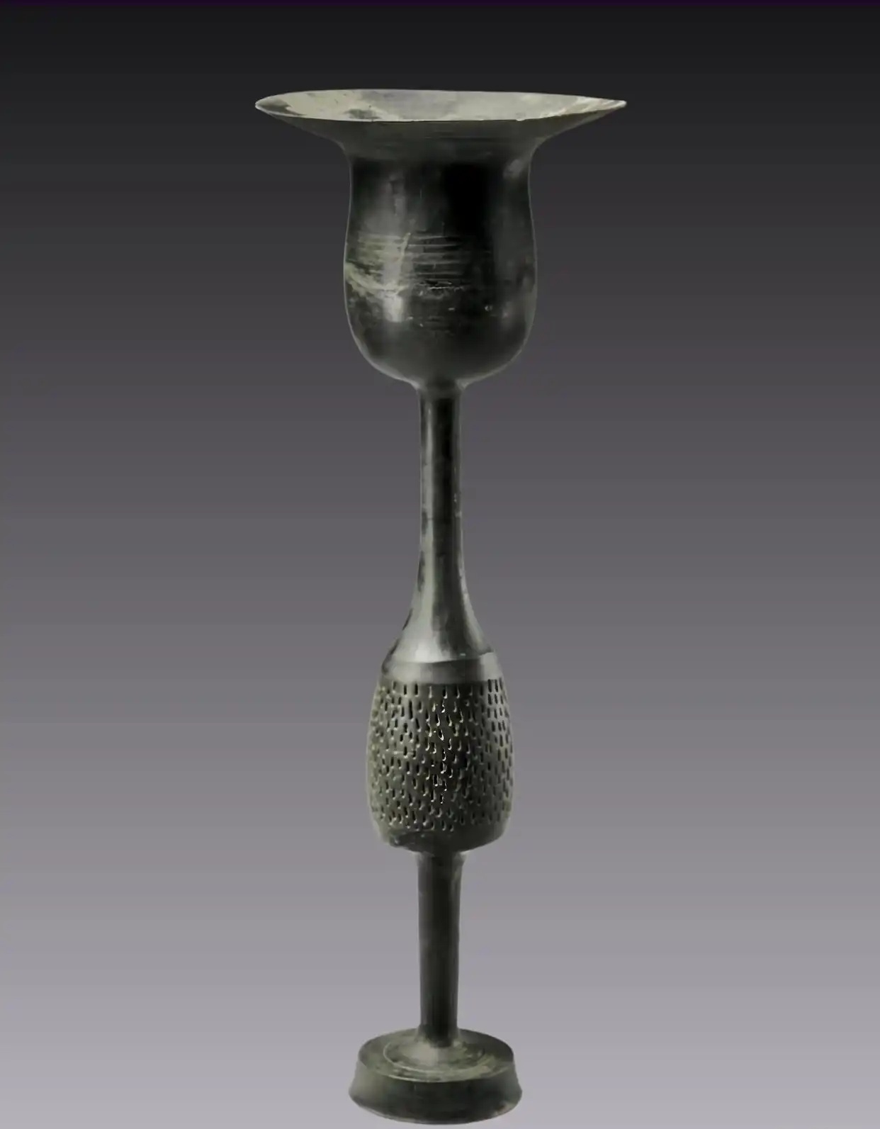新石器龙山文化文物,出土于日照东海峪。高17厘米,口径11.7厘米。整器为两部分套合,杯身作宽沿,直壁圜底,下承圆筒状且两端外侈的杯柄,上饰平行凹弦纹数周。该器以轮制而成,器壁薄如蛋壳(差不多就是0.2毫米厚),表面乌黑光亮。是山东新石器时代考古最重要的发现之一,也是典型龙山文化的重要标志。
