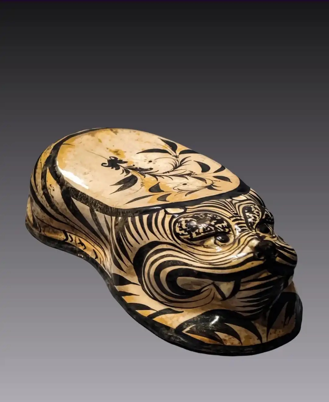 金代虎枕是金代北方瓷窑烧造的典型枕式,以磁州窑产品为代表,河南禹县窑、山西长治窑等亦有烧制。它将实用性与艺术性结合,承载着丰富的文化内涵: 造型多作卧虎状,虎背削平为腰圆形枕面,前低后高或前高后低。虎的神态丰富,或怒目圆睁,或闭目养神。 装饰工艺以磁州窑白地黑彩最具代表性,吸收水墨画技法,黑白对比鲜明。
