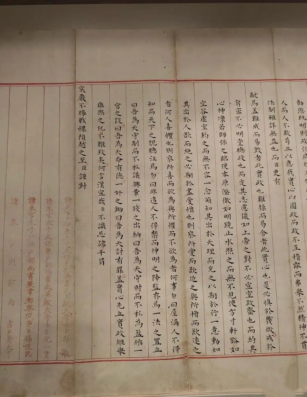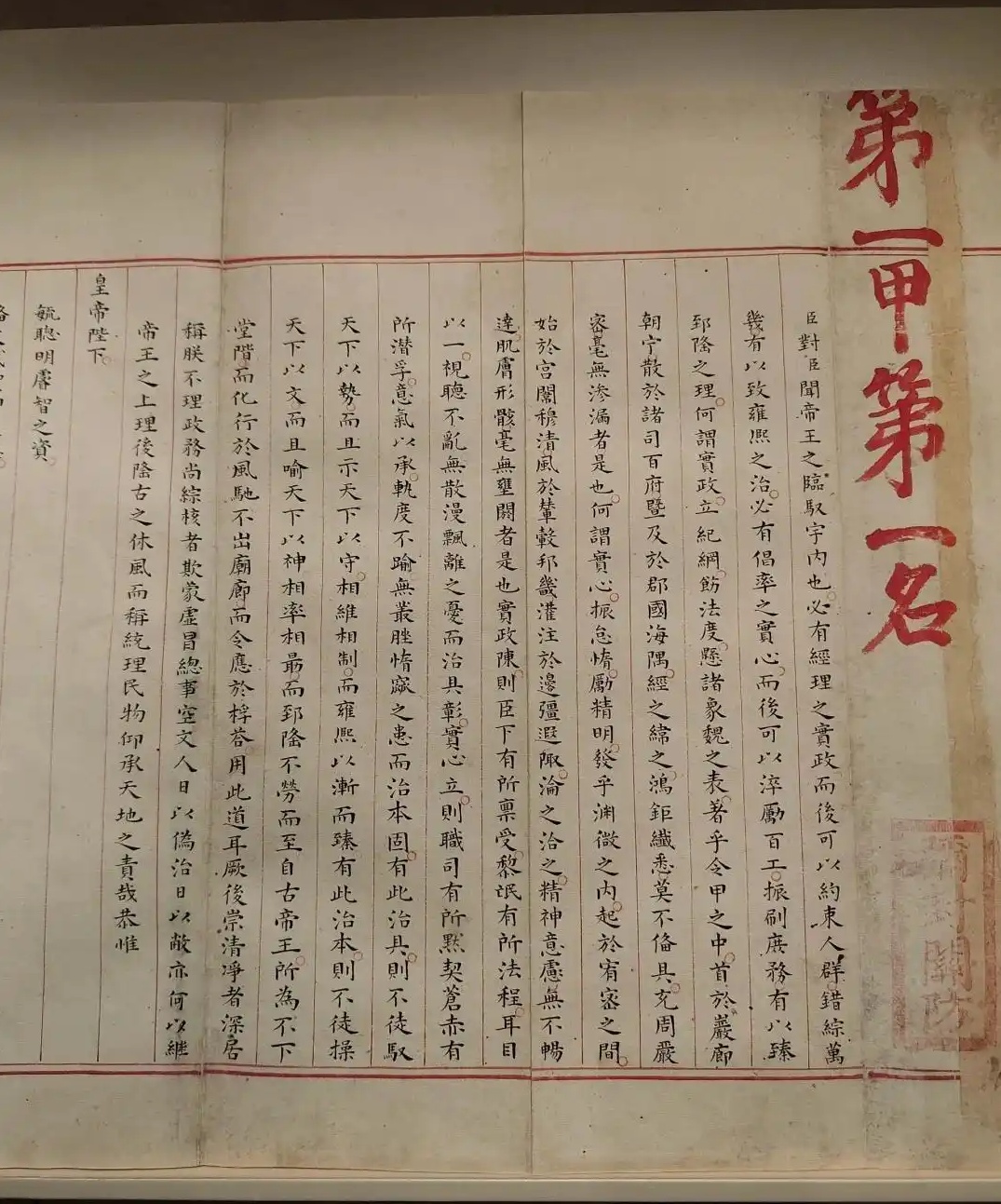 在这份明万历年的殿试状元卷中,赵秉忠用中肯的语言,深入浅出分析了当时的社会矛盾,并针对时弊提出一系列改革的建议。 主张应当“实心先立”、“实证继举”才能使国家太平安乐,还提出“以民为本”的中心思想。 据考证,赵秉忠参加殿试的那一年,是明万历二十六年(1598年)。这是很不太平的一年,内有太子之位牵涉的国本之争,外有日本入侵明朝藩属国朝鲜,与明军拉锯战。 万历皇帝突然看到这一大篇见解独特、文采斐然、情怀满满的文字,朱笔一挥:第一甲第一名。 1983年,赵秉忠的第十三代孙赵焕彬将这份状元卷捐献给了青州博物馆。 历经了400多年的风雨沧桑,这一份状元卷依然保存完好。