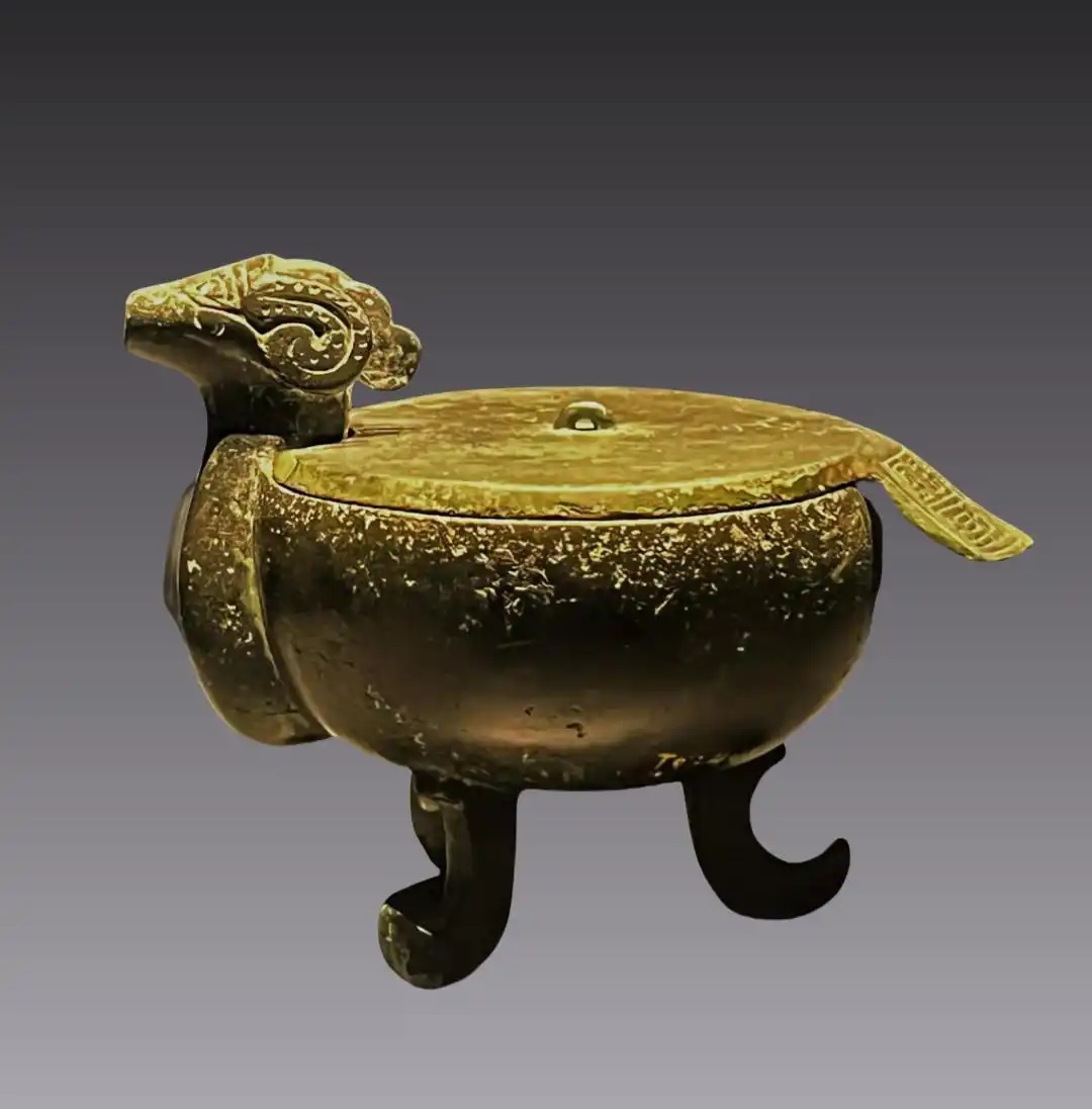 春秋中期青铜器。该尊差平盖,中置牛元纽,一侧作绵羊尾状下斜,上饰勾连雷纹,相对的一侧有缺口与羊颈扣合。口沿铸凸棱一周,和入器身口内。器身直口圆腹,一侧突出羊颈与器腹相通,上为羊头,三钩形足。通高11厘米,口径9.2厘米。这种造型的古青铜器至今还没在国内其它地方发现过。