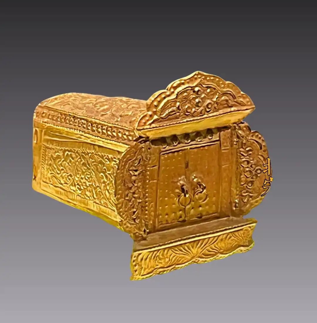 金棺通长10厘米,宽7.7厘米,高7.6厘米,重91.5克。酷似现代木棺,一端大,一端小。系用五块金片,先将部分纹饰模压成浮雕状,再经錾刻,锤揲,然后用金丝穿扣而成。棺盖上隆起,两侧盖沿口紧扣合在棺口外沿;其上饰浮雕缠枝牡丹花纹;棺头前端饰双扇假门,门钉凸起,排列有序并附衔有双门环,门上额及两侧装饰有如意形牙板,门底金片下折呈棺台状;两侧棺身表面錾刻牡丹花纹 ;棺内底部錾刻“重佛舍利”四字。